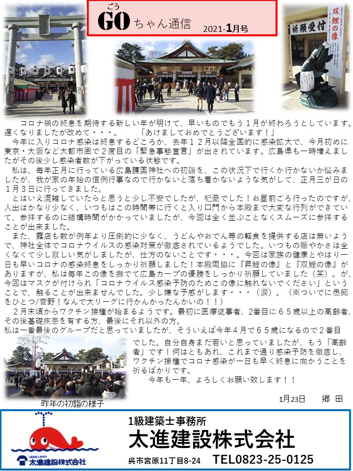 今年に入りコロナ感染は終息するどころか、去年12月以降全国的に感染拡大で、今月初めに東京・大阪など大都市圏で2度目の「緊急事態宣言」が出されています。広島県も一時増えましたがその後少し感染者数が下がっている状態です。私は、毎年正月に行っている広島護国神社への初詣を、この状況下で行くか行かないか悩みましたが、我が家の年始の恒例行事なので行かないと落ち着かないような気がして、正月三が日の1月3日に行ってきました。